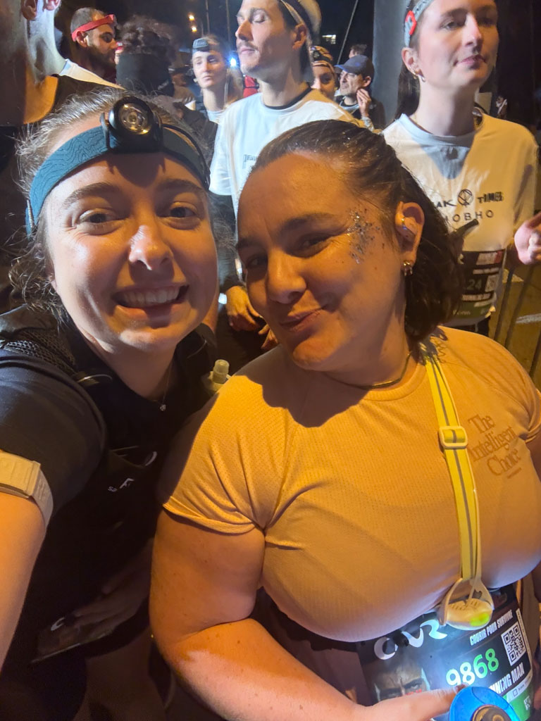 La finish line me laisse toutefois un sentiment mitigé : après cette déferlante d’énergie, les 100 derniers mètres sont étrangement calmes. Pas de médaille, pas de fanfare… un peu décevant, surtout après une telle ambiance. Mais cette petite frustration s’efface vite : j’ai partagé la ligne d’arrivée avec Perrine, et nous avons une photo souvenir parfaite pour immortaliser ce moment.