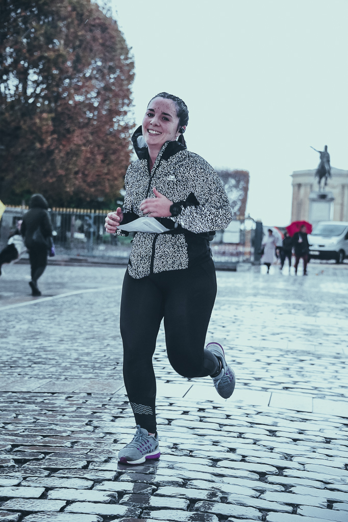 J’arrive sous l’Arc deTriomphe, et je vois le photographe Eric Jouve. Un sourire crispé plus tard, et je commence à accélérer sur ce dernier kilomètre en descente. De légère et agréable, la pluie s’est transformée en véritable déluge glacé. Alors que je continue d’accélérer, je prie pour ne pas glisser et me vautrer sur les pavés mouillés de la rue de la Loge… Puis, c’est le sprint final sur les 200 derniers mètres, avec une belle pointe à 4’38/km. Comme quoi j’en avais encore dans les jambes ! Ou alors, l’envie de me mettre au sec m’a donné des ailes !