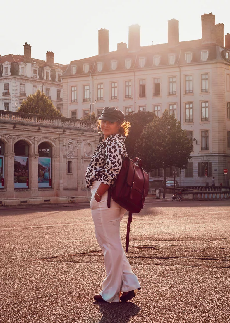 Ici, l’association pantalon blanc et chemise à imprimé animal, je ne l’aurais pas osé il y a encore quelques mois. Pourtant aujourd’hui, je trouve ce look plutôt réussi. Classe, mais confortable. Je me sens tout à fait à l’aise à l’idée d’aller en rendez-vous avec, sans pour autant me sentir déguisée. Une casquette gravoche, un sac à dos vintage pour transporter l’ordinateur et une paire de talons viennent finaliser ce look, en lui apportant les détails nécessaires pour ne pas faire mémère. Parce que l’on ne va pas se mentir, l’imprimé animal peut rapidement être fatal…