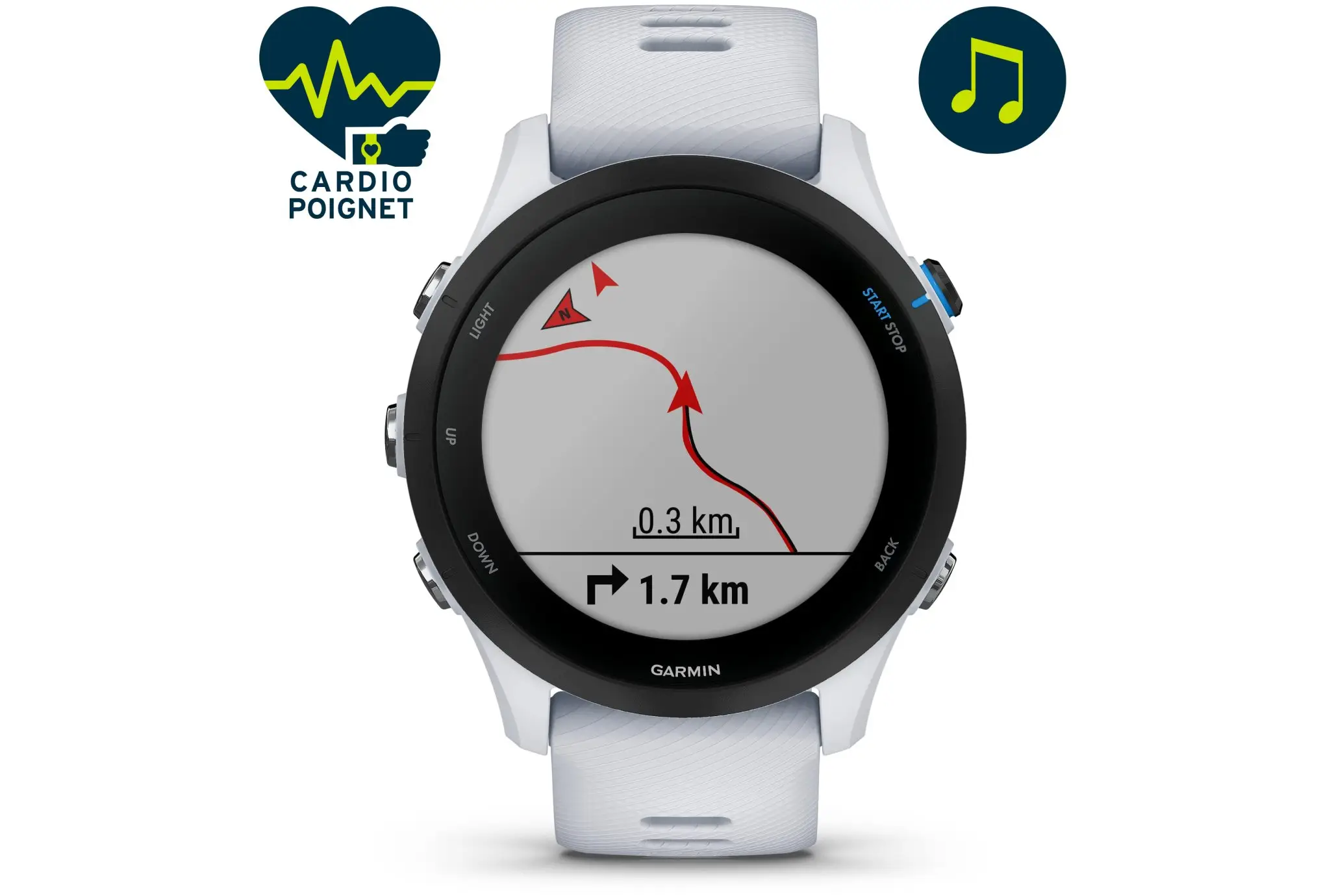 Dès que tu cours 3 à 5 fois par semaine, la précision GPS, les zones cardio bien configurées et l’autonomie deviennent clés. La Garmin Forerunner 255 reste une valeur sûre pour progresser : GNSS précis, ~30 h de GPS, métriques d’entraînement complètes et navigation simple par suivi d’itinéraires. C’est le bon “step-up” quand tu prépares 10 km, semi ou marathon sans exploser le budget.