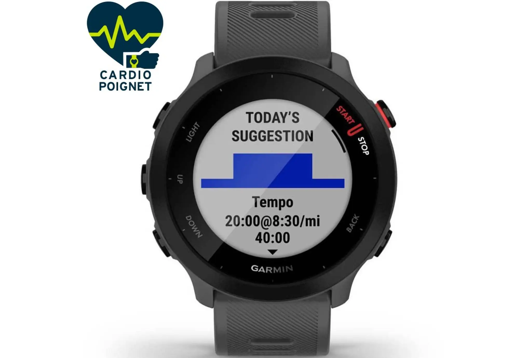 Si tu démarres la course à pied, vise une montre simple, fiable et abordable : distance, allure, fréquence cardiaque au poignet, un peu d’autonomie et c’est parti. La Garmin Forerunner 55 est souvent “la première vraie montre GPS” idéale : profils running clairs, suivi cardio continu et ~20 h d’autonomie GPS pour couvrir sans stress tes sorties et tes premières courses. Elle reste légère, facile à lire, et son interface évite de se perdre dans des menus.
