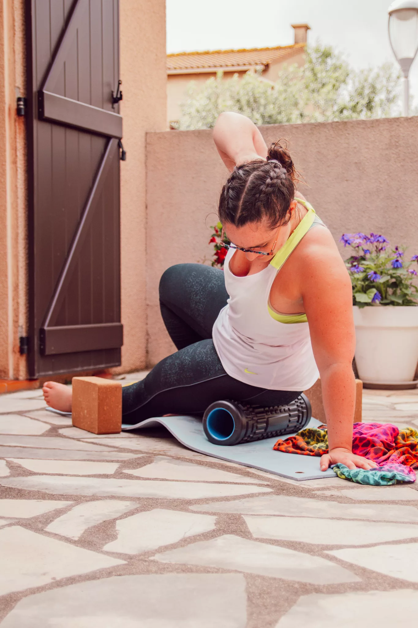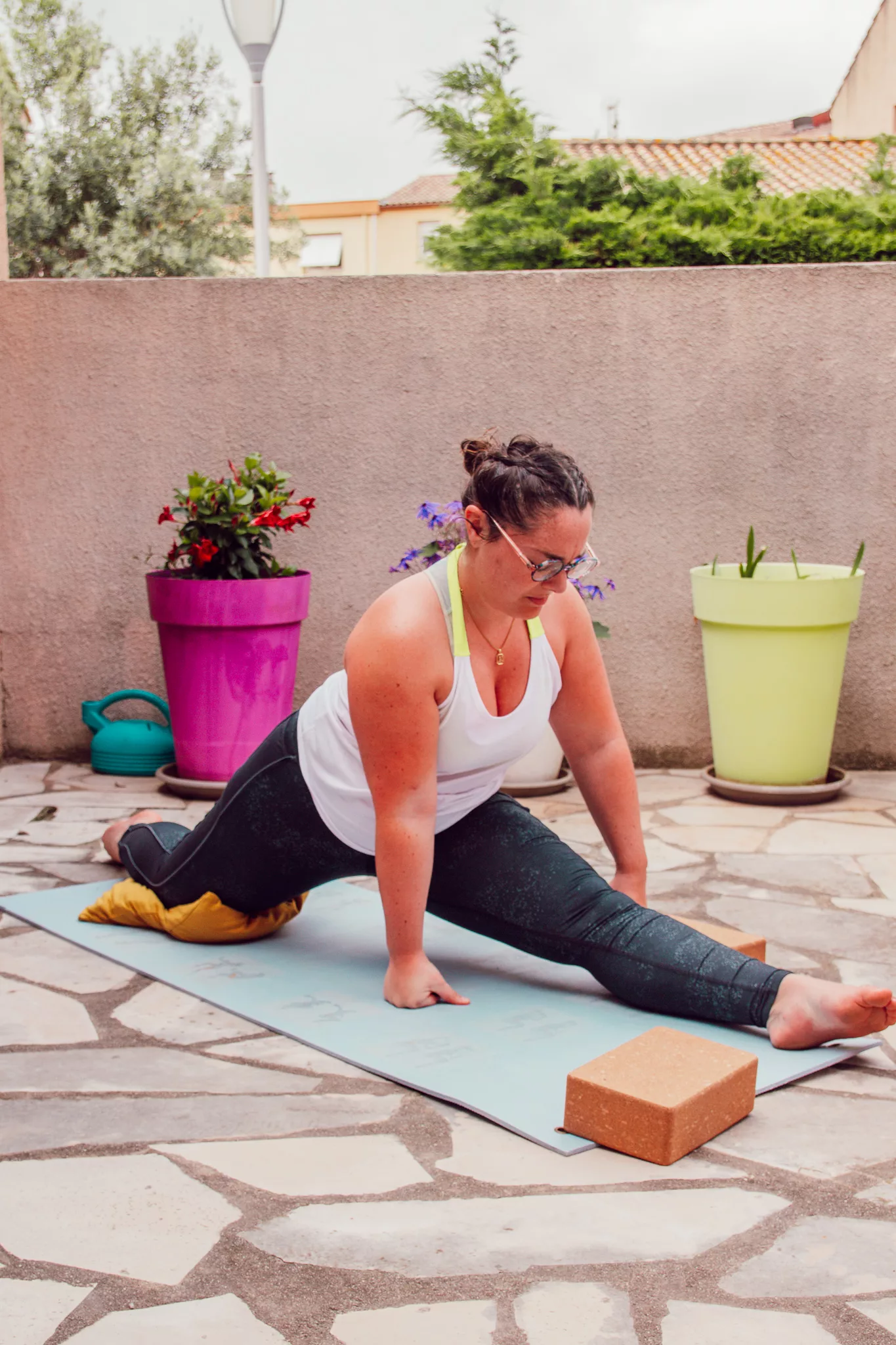 Ensuite si tu le souhaites, pour aller plus loin et si tu ne trouves pas l’équivalent dans ton salon, je te recommande l’achat de deux briques de yoga (plutôt en liège car plus pratique et plus agréable en cas de transpiration), des sangles de yoga (ou un paréo comme moi ou une serviette micro-fibre), et un petit coussin fin pour plus de confort pour tes articulations. Par exemple, et comme tu as pu le voir sur certaines photos, je glisse le mien sous le genou qui supporte mon poids quand je suis en grand écart. Les briques de yoga vont te permettre de te redresser et de trouver un appui plus confortable quand tu manques d’amplitude. De même pour les sangles qui t’aident à travailler les postures du Y ou du danseur quand tu n’arrives pas encore à attraper ton pied.