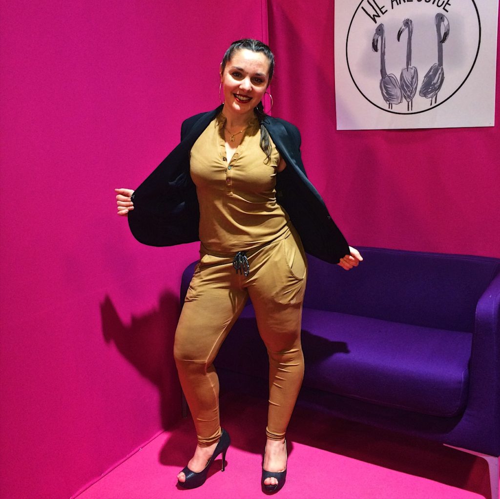 J’étais juste ravie de pouvoir découvrir ce nouvel univers, parce qu’il faut reconnaître que la mode et moi, ça fait deux… Bref, j’arrive le samedi après-midi les yeux émerveillés et je passe du temps avec Sichen à son stand. À un moment, nous partons Sylvain et moi, déambuler dans les allées du salon… Et on tombe nez à nez avec une magnifique combinaison bleu turquoise exposée sur un mannequin. Je dis à Sylvain que c’est exactement le type de vêtement que j’aime, mais que le problème, c’est que généralement elles ne sont pas taillées pour les formats minimoys comme le mien. Sylvain me répond que je n’ai qu’à essayer pour voir. Ne comptant rien n’acheter, je refuse pour ne pas déranger les personnes s’occupant du stand pour rien.