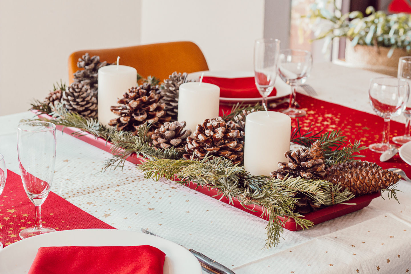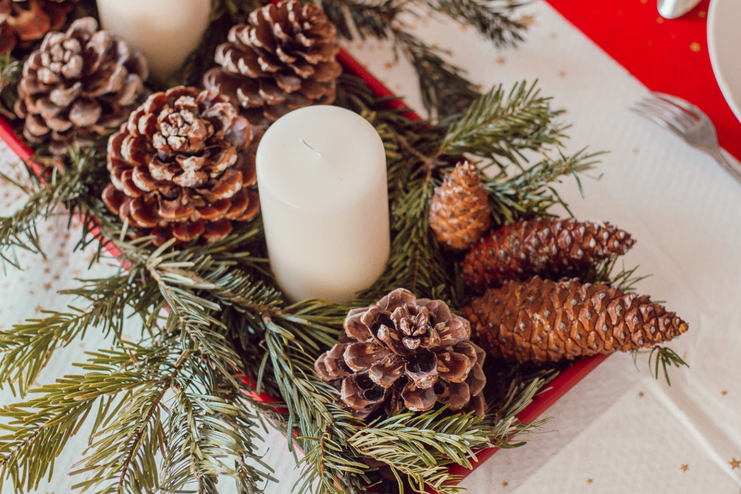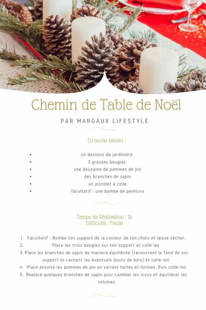 Un conseil : avant de te lancer, réalise un « brouillon » de ton chemin de table. C’est-à-dire place bougies, branches de sapin et pommes de pin sans les coller, juste pour déterminer la place de chacun et imaginer le rendu final. Une fois que tu as ton plan de travail bien en tête, enlève le tout. Et procède étape par étape au collage des éléments.