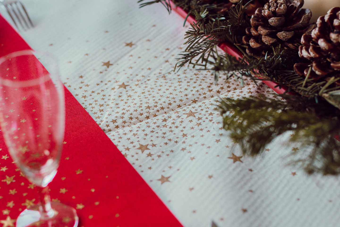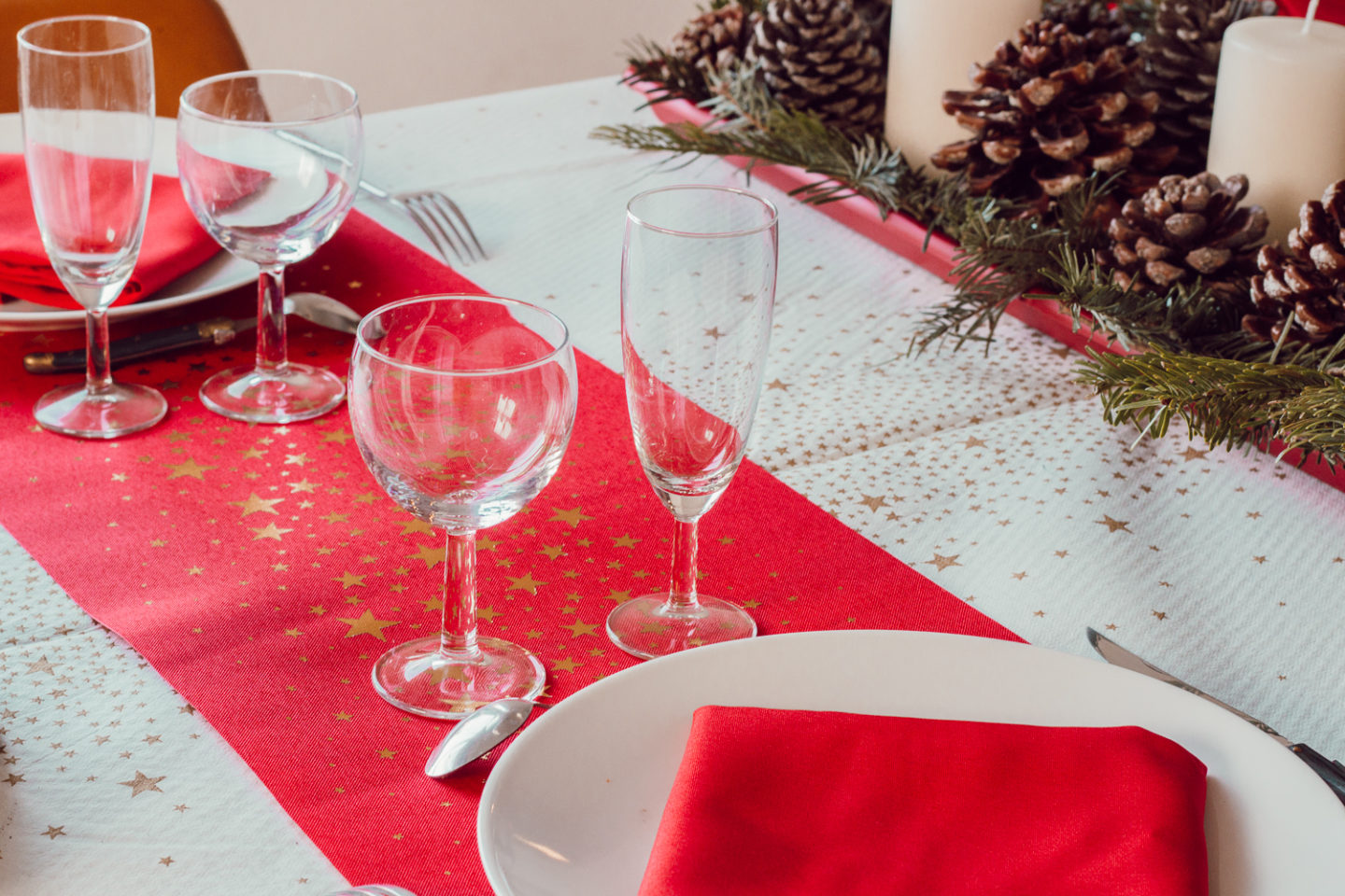 Je dois avouer que j’étais aussi particulièrement tentée par un set de couverts dorés, ainsi que de jolis verres à pieds. Mais j’avais décidé d’utiliser au maximum ce que mes parents avaient déjà. À commencer par la vaisselle ! Or, leurs coupes à champagne et leurs verres à vin sont en parfait état, bien que standards. Puis, quitte à acheter, autant prendre des choses que je pourrais facilement utiliser. Or, ces couverts dorés, malgré leur beauté et le fait qu’ils auraient parfaitement fini ma table de Noël, je n’en avais pas vraiment besoin…