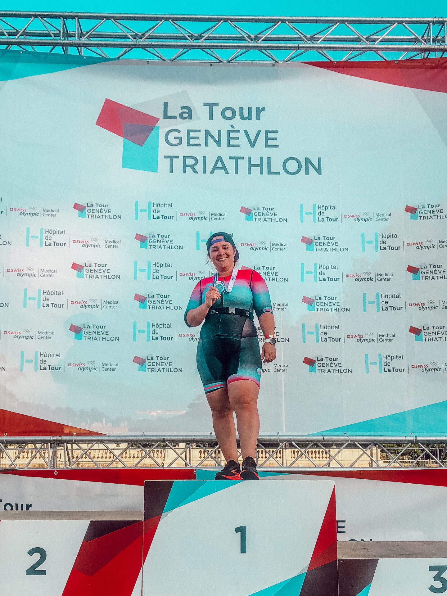J’arrive dans le dernier virage et là je vois l’arche d’arrivée. Ce sont les 200 mètres les plus longs de ma vie. J’essaie d’accélérer, mais j’ai l’impression d’être lourde. Cela doit être seulement une impression parce que je suis floue sur mes photos de la ligne d’arrivée. Je finis mon triathlon S de Genève en 2 heures, 1 minute et 39 secondes… Je n’ai pas le sub 2h voulu, mais je fais mieux de 30 secondes par rapport à l’année dernière.