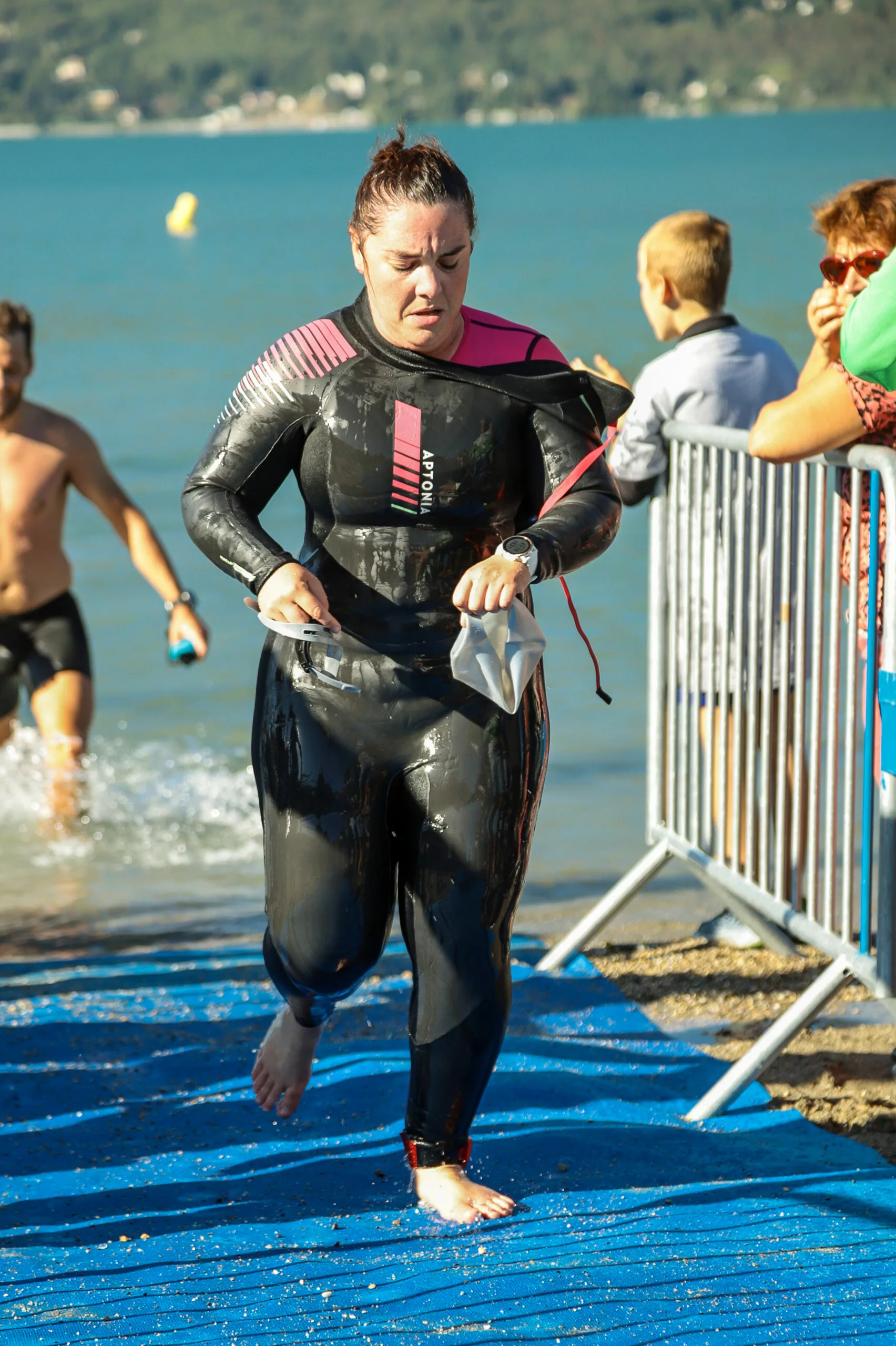 La moitié du parcours est faite. Maintenant, il reste 750 mètres à parcourir pour sortir de l’eau et attaquer ma transition. Je ne vais pas te mentir, j’ai détesté cette partie. J’étais au milieu des hommes qui me doublaient tous les uns après les autres. Et je me prenais des coups dans tous les sens. Plus d’une fois j’ai bu la tasse. J’ai passé mon temps à râler et à pester contre tout et tout le monde. L’avantage, c’est que cela m’a fait passer le temps et que je me suis retrouvée sur le bord beaucoup plus rapidement que prévu. Enfin, dans ma tête, c’est passé plus rapidement que prévu. À ma montre, je suis dans mes chronos habituels d’entraînement. Soit 47 minutes.