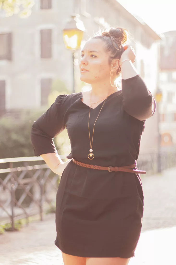 Normalement, c’est une coupe droite, mais elle me flatte plus la silhouette en la marquant à la taille. Raison pour laquelle j’ai rajouté une petite ceinture camel assortie à mes talons, shoppés sur Vinted, il y a deux ou trois étés maintenant. Mon sac à main vient d’une petite boutique dans le centre ville de Montpellier Shop Home Paradise. Côté bijoux, je te les avais présentés sur Instagram. Ils proviennent de la boutique Etsy de ma meilleure amie Flore. Elle crée des bijoux en toute petite quantité, bien souvent un ou deux exemplaires d’un modèle. Et personnalise énormément. Par exemple, elle a raccourci la chaîne du sautoir que je porte étant donné que je suis petite.